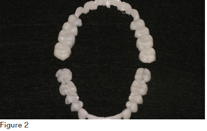 The teeth were left untreated and a preliminary impression was taken and sent to the lab. The lab created a wax up with new vertical dimensions and milled a continuous top and bottom temporary restoration out of PMMA (Fig. 2).