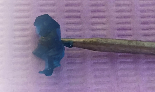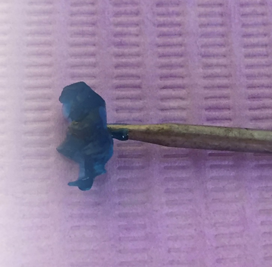 To create the pattern – i.e., the “stamp” – place soap or other separating medium on the occlusal surface of the tooth and flow a low viscosity resin or hard setting liquid dam material onto the surface (Fig. 2). Place a bur shaft (or microbrush) into the resin, and light cure. The bur shaft will act as the handle for the stamp (Fig. 3). Prepare the cavity in the usual manner (Fig. 4).