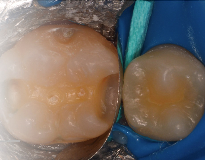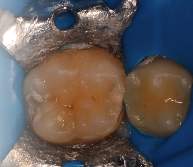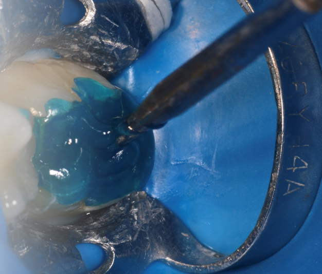 The “stamp” technique can be used in Class II cavities (Fig. 1) if the practitioner follows a two-step procedure: first reconstructing the mesial surface, and then filling the cavity as a Class I. The only restriction of the technique is to choose teeth with intact occlusal anatomy.
