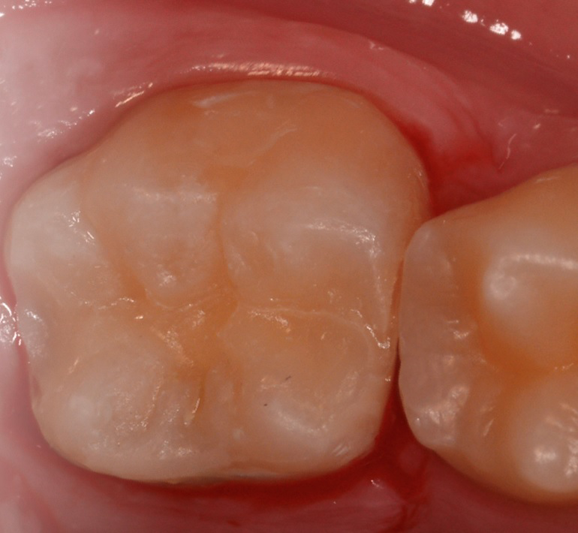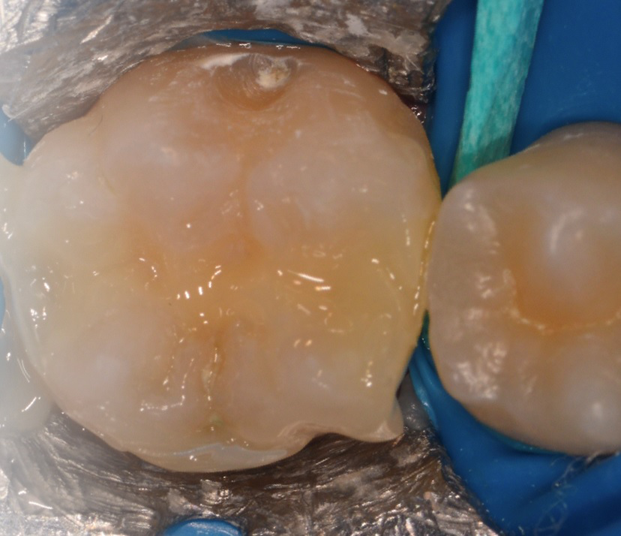 Fig. 6: ACTIVA is applied to the occlusal surface, covered with Teflon, and the stamp is pressed with the help of the bur handle, creating the anatomy. The Teflon prevents the stamp from sticking to ACTIVA. Fig. 7: The occlusal surface after light curing. Fig. 8: The final ACTIVA restoration after finishing.