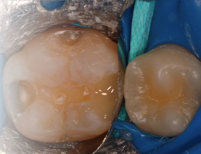 Fig. 1: A pre-operative photograph. Fig. 2: A stamp replicating the occlusal anatomy of the molar is made with a light cure flowable resin or hard setting liquid dam material. A bur is placed in the material to serve as a handle, and then it is light cured.