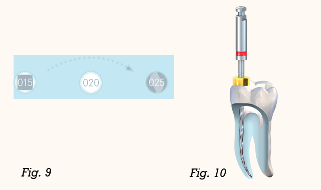 Select the appropriate size of the F6 SkyTaper file according to the size of the previously used file. With the file attached to a torque-limited endodontic contra angle or motor, prepare the canal, using a pecking motion, to the full working length of the file. Maintain thorough irrigation to flush out all debris throughout treatment.