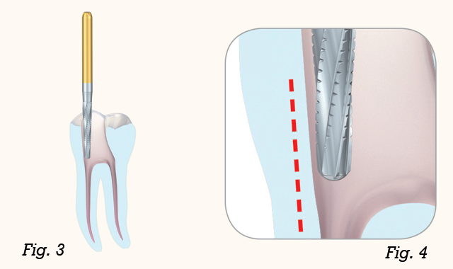 After the pulp chamber has been opened, prepare the access cavity with the Komet® tungsten-carbide EndoGuard™ instrument, which features a safe-non-cutting tip to protect the floor of the pulp chamber.