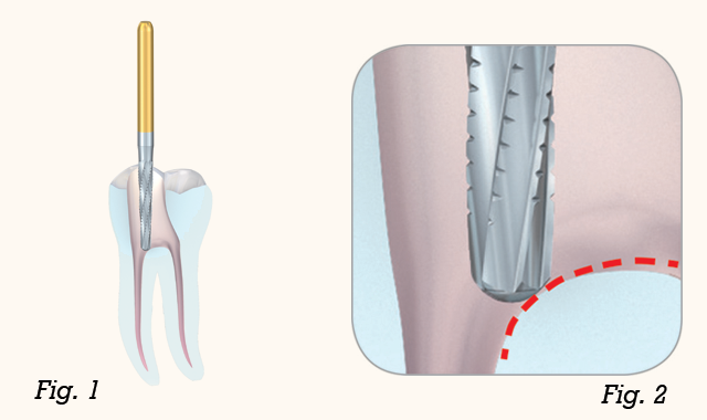 Use the EndoGuard to remove dentin overhangs to optimize visual examination and assessment and to provide straight-line access to the root canal, thus minimizing risk of inadvertent canal transportation and file fracture.