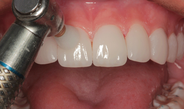 Final polishing was accomplished with an Enhance cup (Dentsply/Sirona) as shown in Figure 22. Interproximal areas were polished with aluminum oxide strips (Epitex, GC) as seen in Figure 23.
