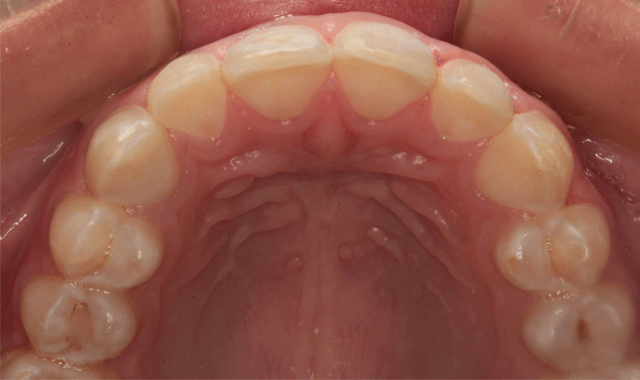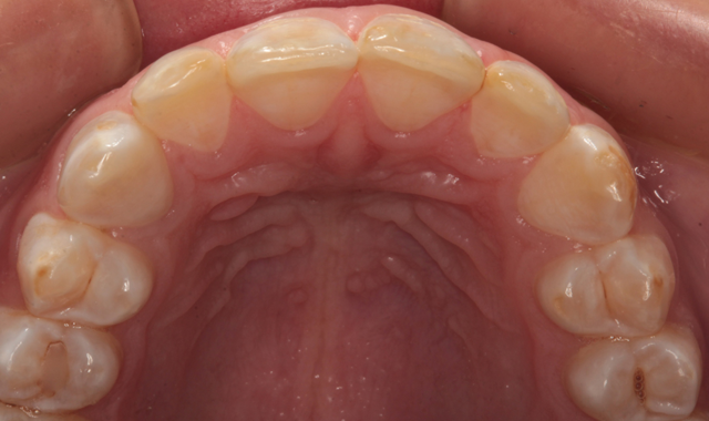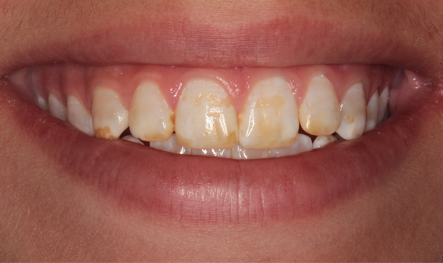 Figure 1 shows her smile before treatment. A retracted view illustrates that she had developmental enamel defects that resulted in decalcified surfaces (Fig. 2). Some areas had white spot lesions and others had brown areas where the white spots had incorporated stain over time. The incisal view in Figure 3 shows well-aligned teeth. Clinical and radiographic examination revealed excellent dental health with no periodontal disease or caries.