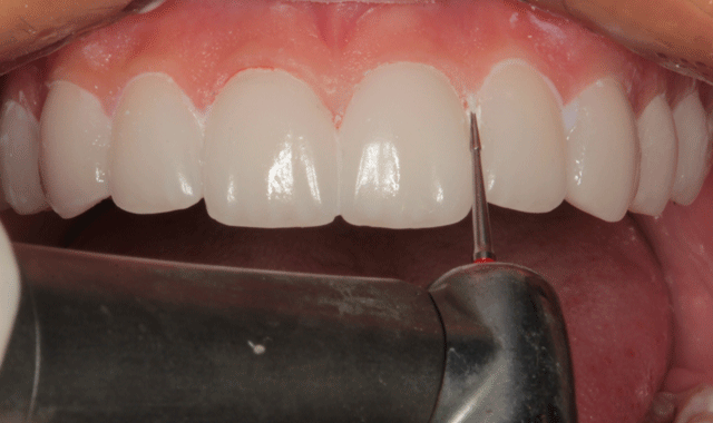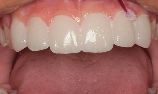 The first veneer can be seen in place in Figure 13. The other five veneers were placed (Fig. 14) and excess veneer cement was teased away from the margins with an applicator tip (Fig. 15).