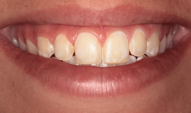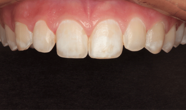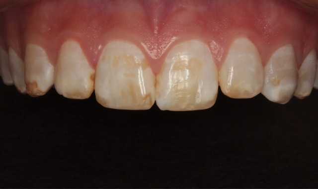 By using a minimally invasive technique, I was able to enhance this patient’s smile by removing affected enamel and replacing it with thin ceramic veneers. A self-adhesive resin cement was used to further simplify the technique.