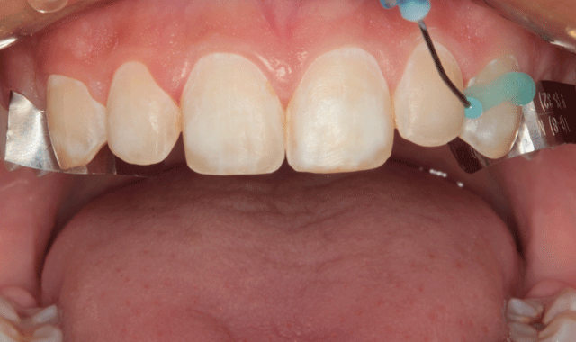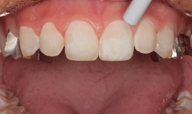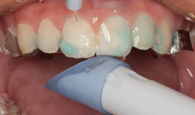 Again, no anesthetic was required for placement. The six anterior teeth were isolated using thin metal strips and enamel etch was applied (Fig. 9). The etching gel was left in place for ten seconds (Fig. 10) and thoroughly rinsed (Fig. 11) and the etched surfaces were dried with oil-free air from an air/water syringe (Fig. 12).