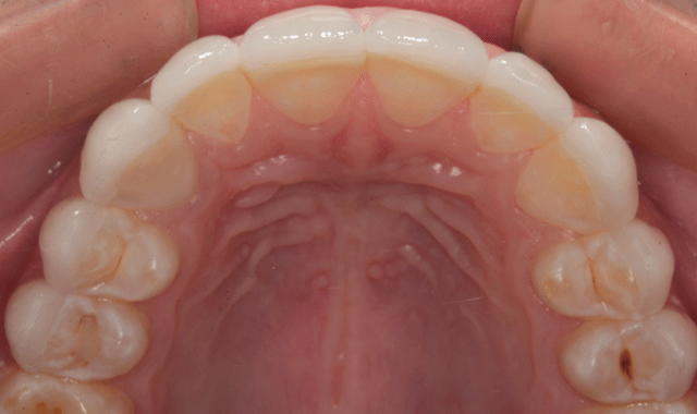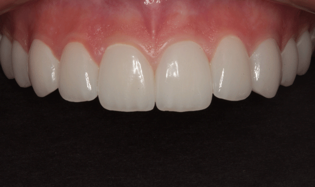 Final impressions were taken with a PVS impression material and an opposing impression and bite registration were taken. No provisional restorations were needed as the patient was happy with her new smile after preparation (Fig. 6).