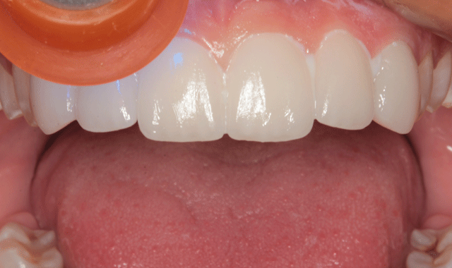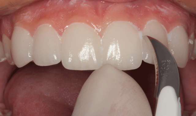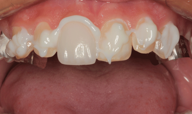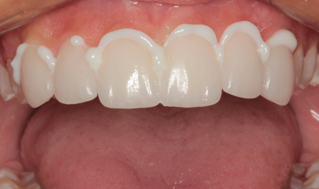 A self-adhesive light-cured resin cement, FUSION-Zr Multi-purpose Veneer Cement (Taub Products), was applied directly to the etched surfaces. The right central incisor veneer was placed using a cotton plier.