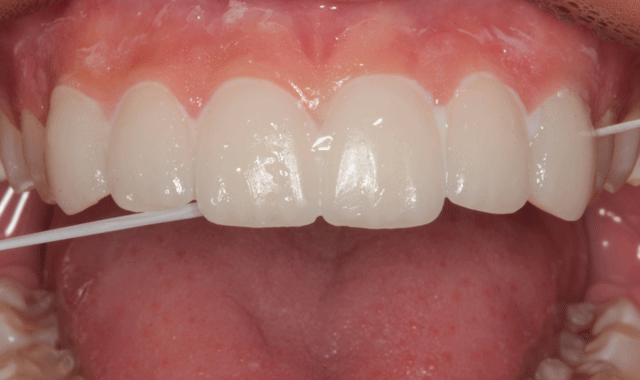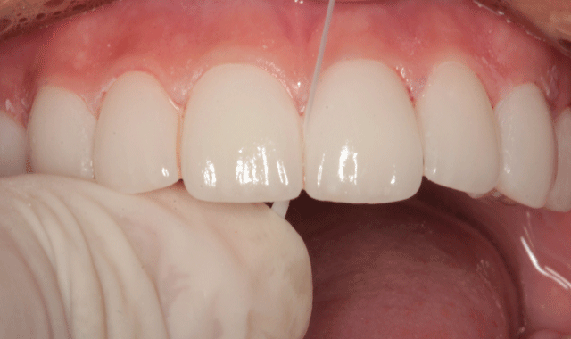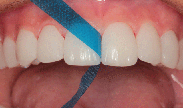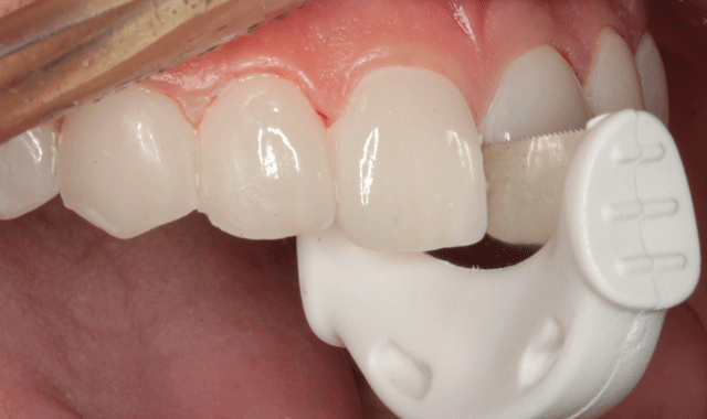 The premolar veneers were placed in the same fashion. A carbide finishing bur (ET2 bur, Brasseler) was used to remove excess cured resin at the margins of each veneer (Fig. 19). Where floss could not be worked into the interpoximals, a separating strip was used to remove excess composite cement (Fig. 20). After all interproximal areas were cleared, they were checked with floss (Fig. 21).