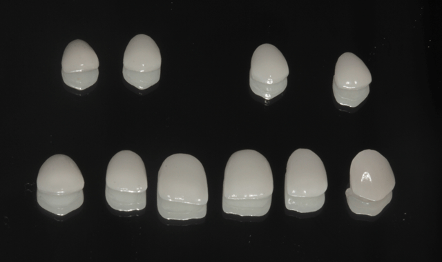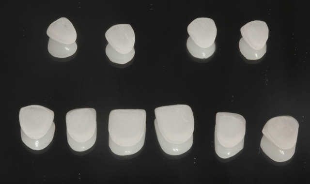 The final impressions and bite registration along with photographic images of the patient were sent to the dental laboratory (daVinci Laboratory) with the request to fabricate thin veneers with lithium disylicate (e.Max, Ivoclar). Shade OM2 (Vita 3D shade guide) was chosen by the patient. The veneers can be seen photographed on a mirror surface in Figure 7. The internal etched surfaces are shown in Figure 8.