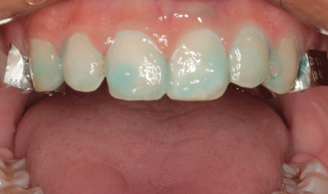 No anesthetic was necessary and the tooth surface was refined using a fine finishing diamond bur with water spray. Preparation involved removing the defective enamel and providing draw.