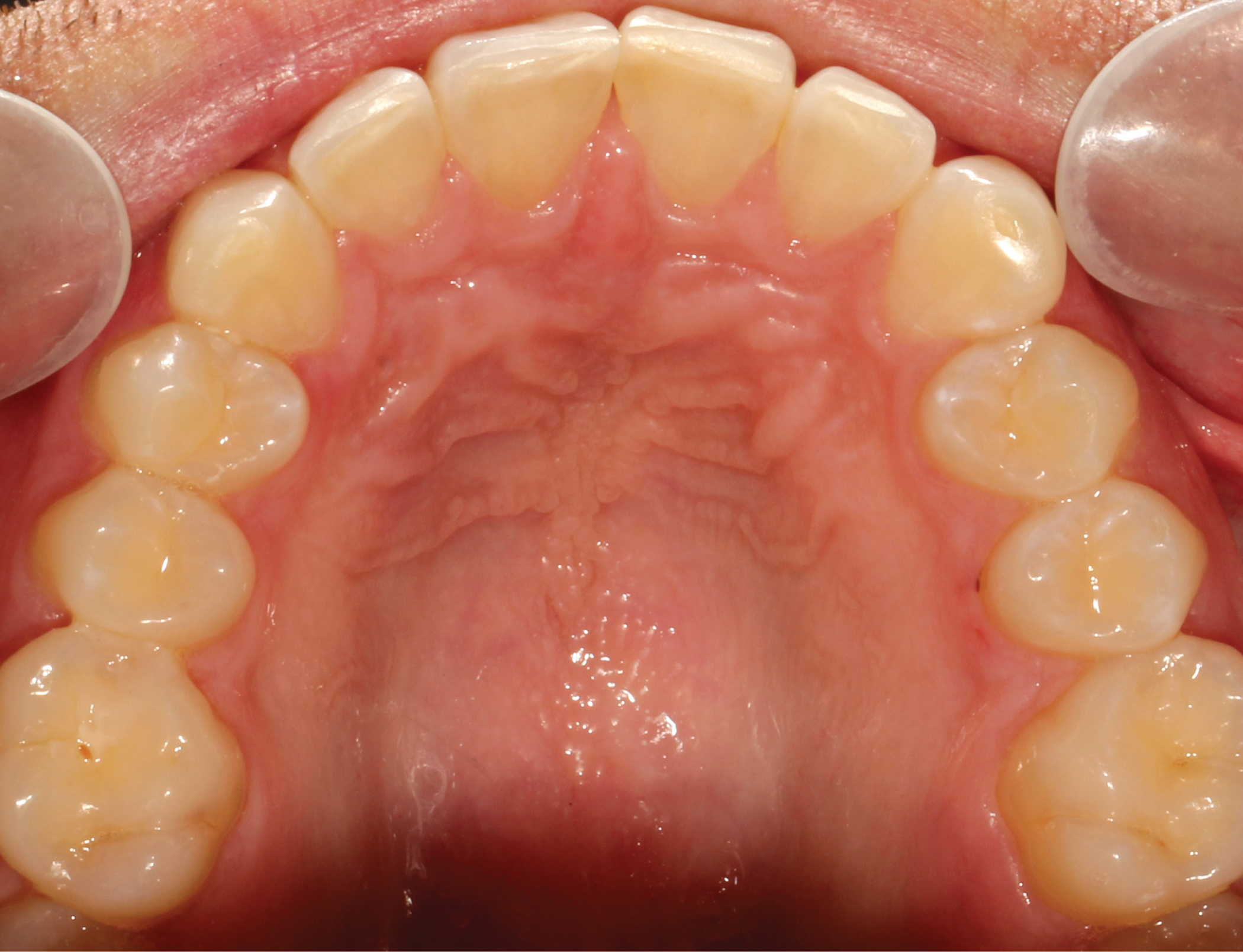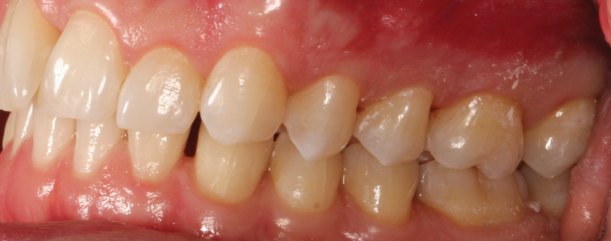 Packable Filtek™ Supreme composite was placed in the inside of the template in each engager space. The template was then placed onto the teeth and the composite was molded to the tooth. The engagers were then light cured and the template was removed. A fine diamond bur was used to remove extra flesh and the engagers were lightly polished.