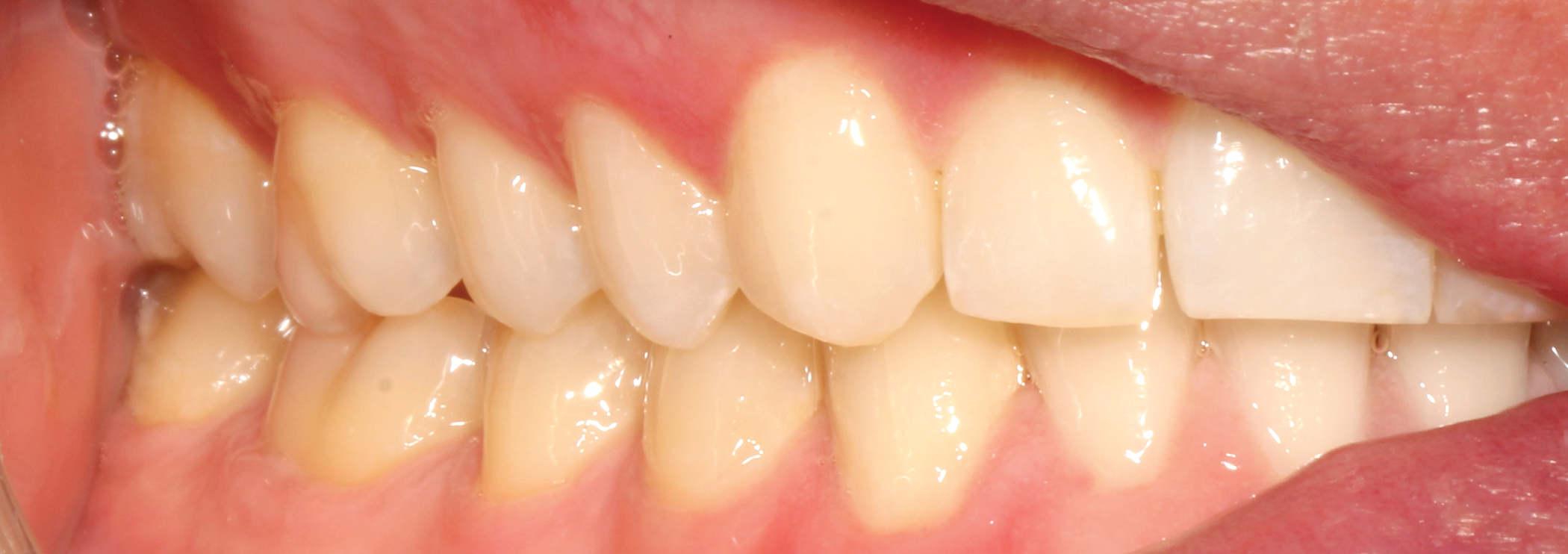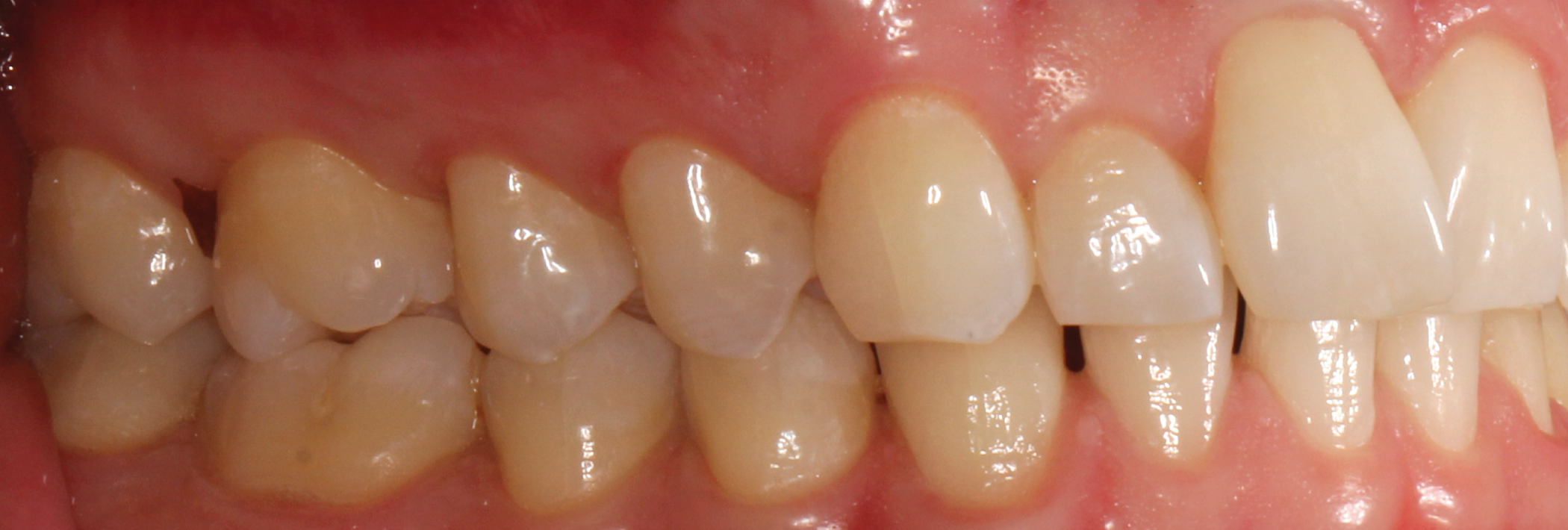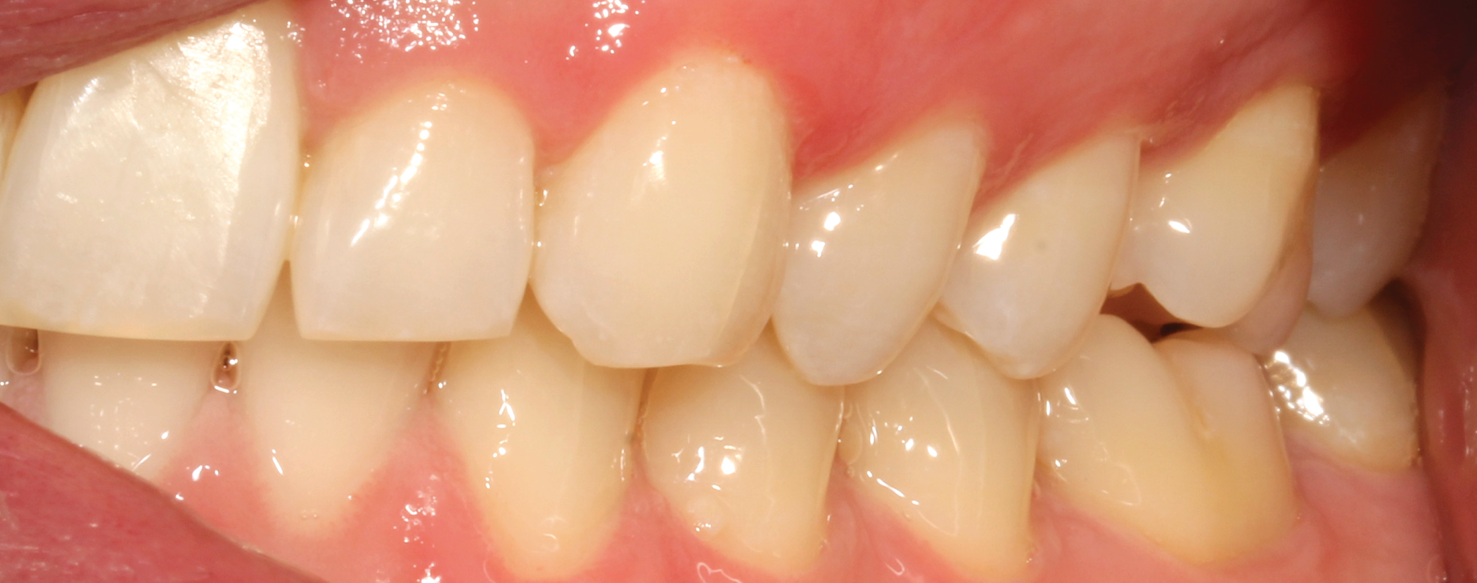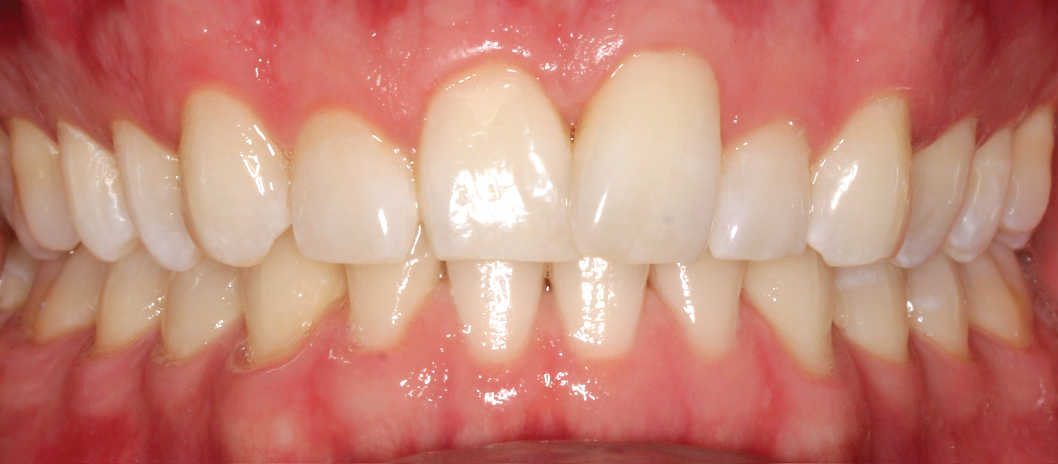 The treatment goals for clear aligner therapy were focused on rotating tooth 9, extruding tooth 9 and subsequent enameloplasty to even out the maxillary anterior teeth. The patient also had mild Class II molar and canine relationships with crowding and spacing discrepancies in the anterior teeth. The goal with the extrusion of tooth 9 was to move the adjacent bone and soft tissue coronal with the tooth movement. Additional space was needed for the maxillary teeth to accommodate the rotation of tooth 9 into the correct position. Lastly, extra spacing between the lower teeth was to be treated along with the mild Class II malocclusion (Figs. 1-8).