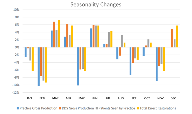 Results indicate that nationally, the busiest months are March, April and June; these primarily spring months are before schools let out, when individuals and families are preparing for the summer months and vacations. December is of note, it exceeds the average for doctor gross production, patients seen and direct restorations, despite practitioners taking off time for the holidays. In contrast, the slowest months were January, February, May, September and November, months either when school starts and ends or during the winter holidays that for many includes significant financial burden.