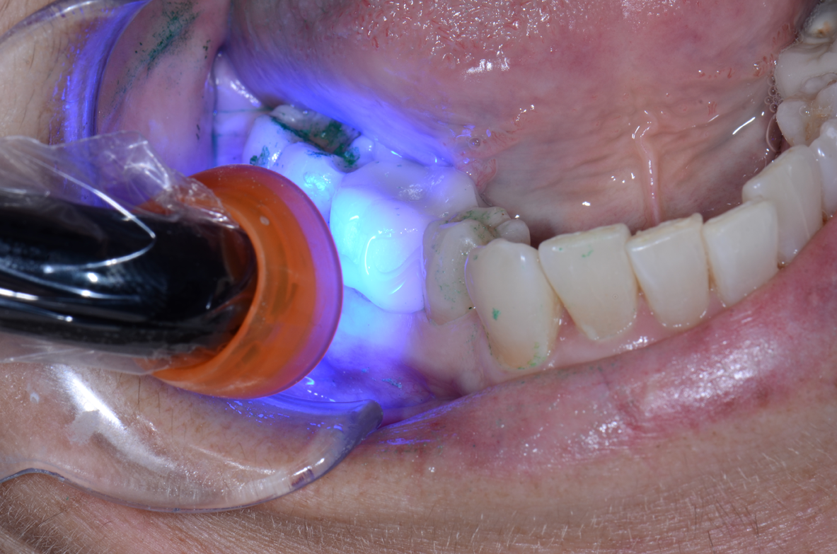 4. Floss the contacts to remove excess that is wedged interproximally. Using your light-curing unit, cure for 20 seconds from the buccal and then again on the lingual. This will increase the translucency and the set of the material. The chemical cure time of the cement is six to seven minutes intraorally. A final light curing facilitates easy and efficient cleaning of the excess while increasing the initial cure. The set of the material is sufficient to rinse the patient, sit them up to deliver post-op instructions and ultimately release them.