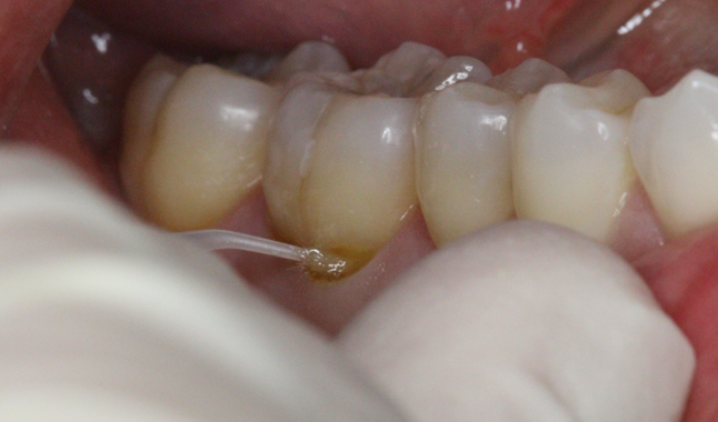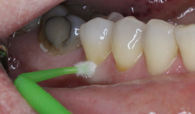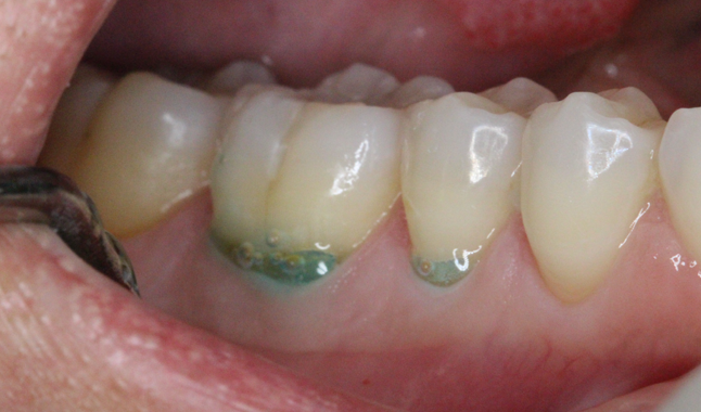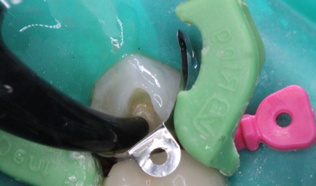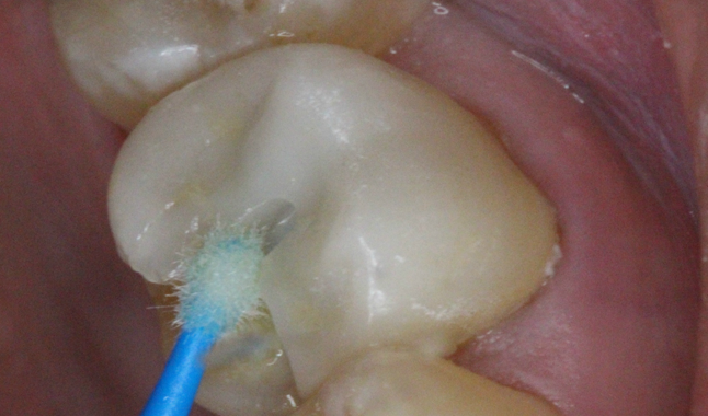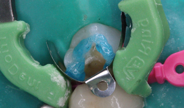 With our final area for treatment we moved to the symptomatic areas of sensitivity in the lower premolars. The surface was hard to the touch and did not require preparation. Universal adhesive [Futurabond U; VOCO] was massaged into the abfraction for 20 seconds as per the manufacturer’s instructions and cured.