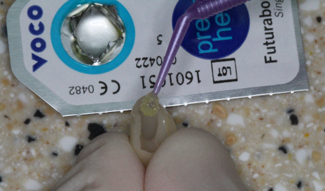 We then used a universal adhesive [Futurabond U; VOCO] which allows us to achieve a high initial bond strength, as well as inhibiting enzyme activity and potential hydrolysis in a single layer.