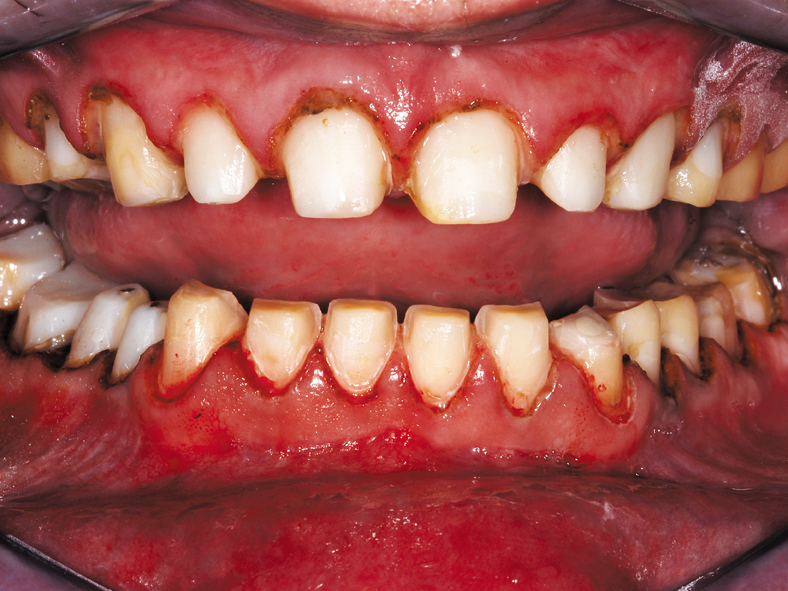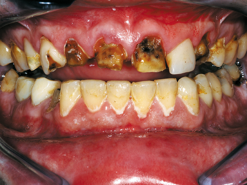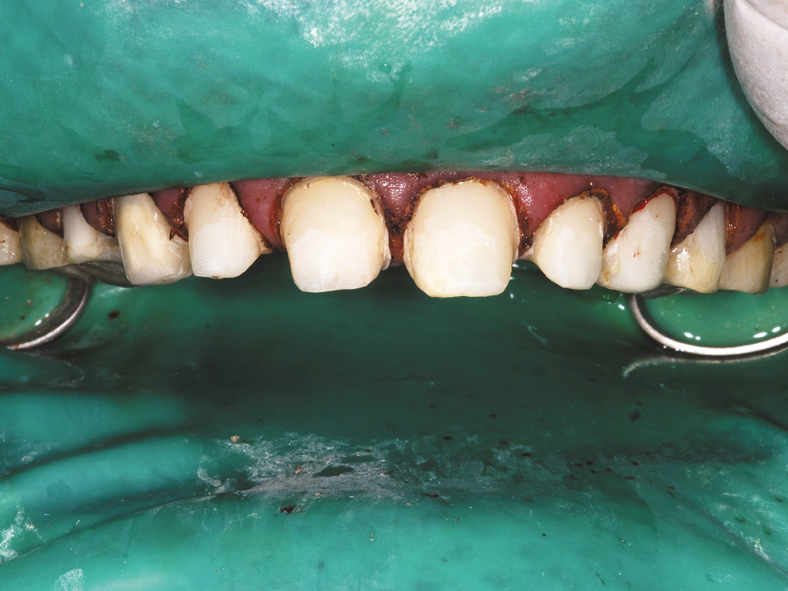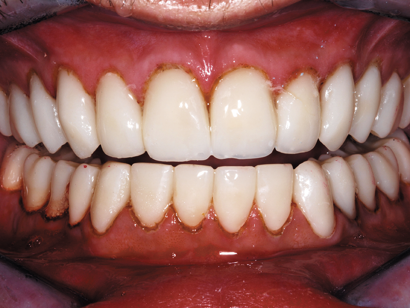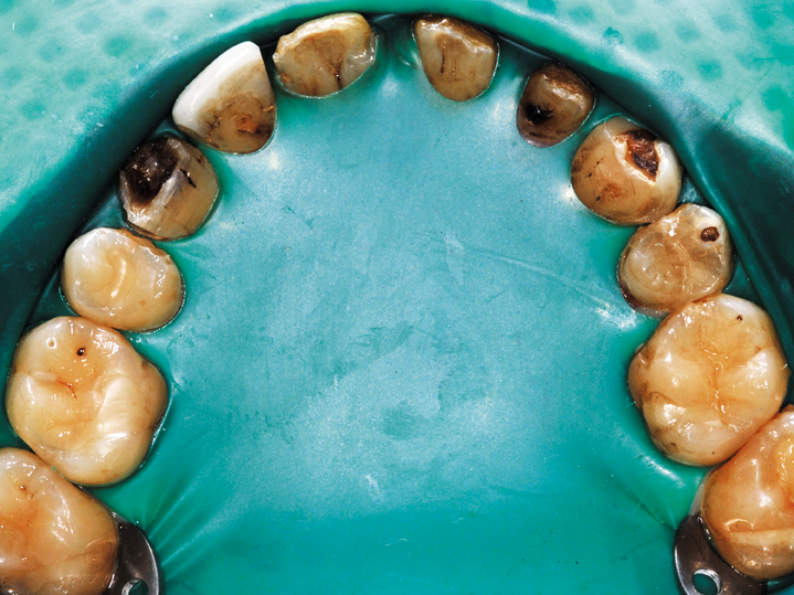 He stopped his prior dental treatment while still in his temporary restorations. He eventually lost the temporaries and went without for several years. As a result he was left with extensive decay in the previously prepared anterior teeth (Figs. 1, 3).