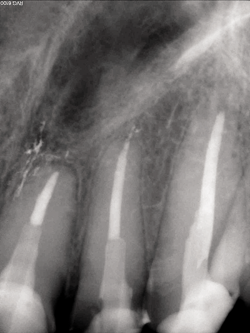 He also had numerous areas of new decay in most of his remaining teeth, requiring a full mouth reconstruction. Our treatment plan was a 24 tooth reconstruction (missing first bicuspids) with root canal treatment for teeth #7-11 with fiber post build-ups using CORE-FLO DC LITE.