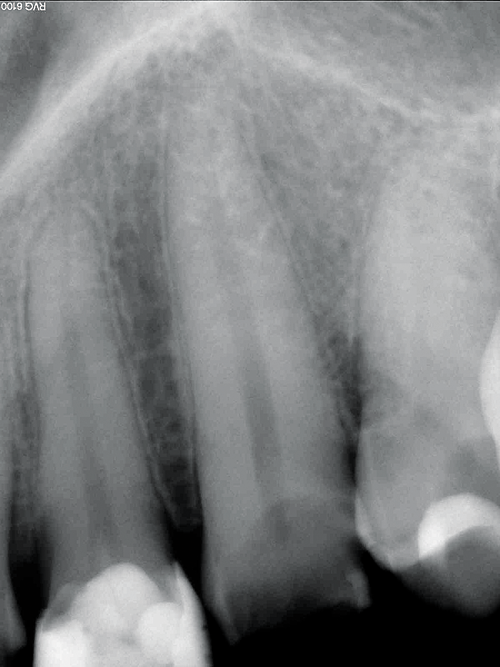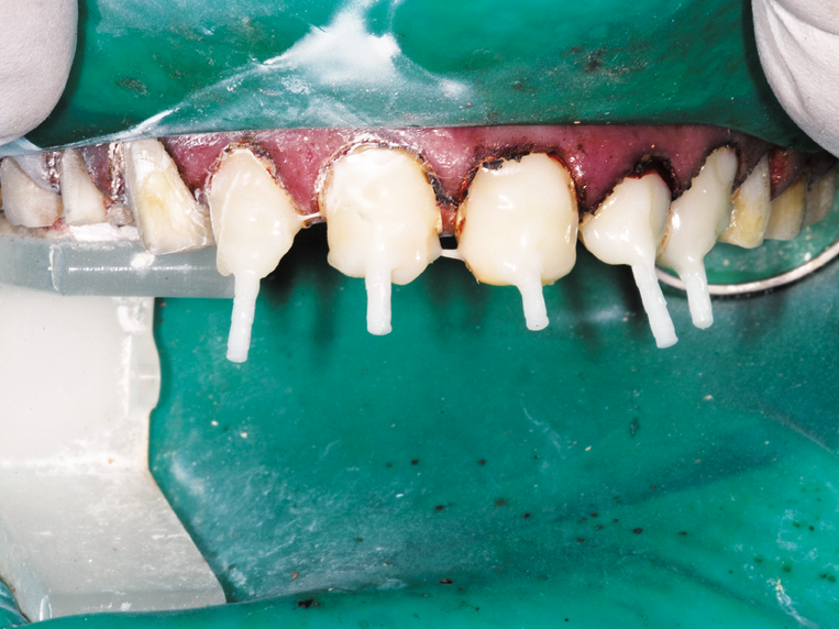 On the maxillary preparation day the entire upper arch was anesthetized with articaine with 1:100,000 epinephrine and a full arch rubber dam placed (Fig. 4). The severely damaged anterior teeth #7-11 were cleaned and shaped for gutta percha final fill, then prepared for the fiber core posts (Fig. 5). Bisco’s dual-cured UNIVERSAL PRIMER was placed and agitated for 30 seconds on all five teeth at once.