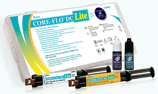 It can also be used as a dentin replacement material. CORE-FLO DC LITE comes in an auto-mix dual-syringe. It is intended to be used with any adhesive that is compatible with dual-cured resins. The CORE-FLO DC Lite intro kit is available with UNIVERSAL PRIMER™, a low-film thickness, dual-cured adhesive/primer designed for the dentist who prefers not to light cure the adhesive layer under indirect restorations. The dual-cured adhesive is also ideal for use when cementing posts.