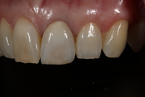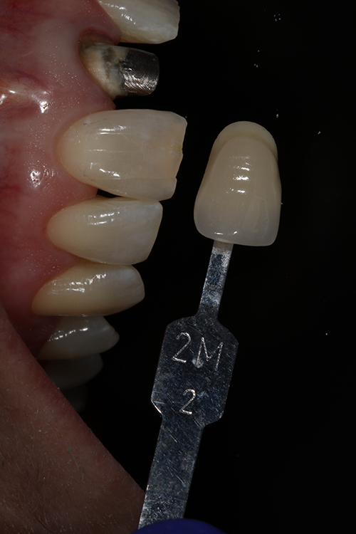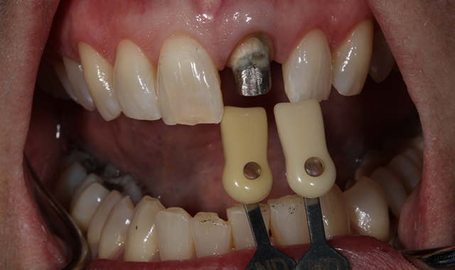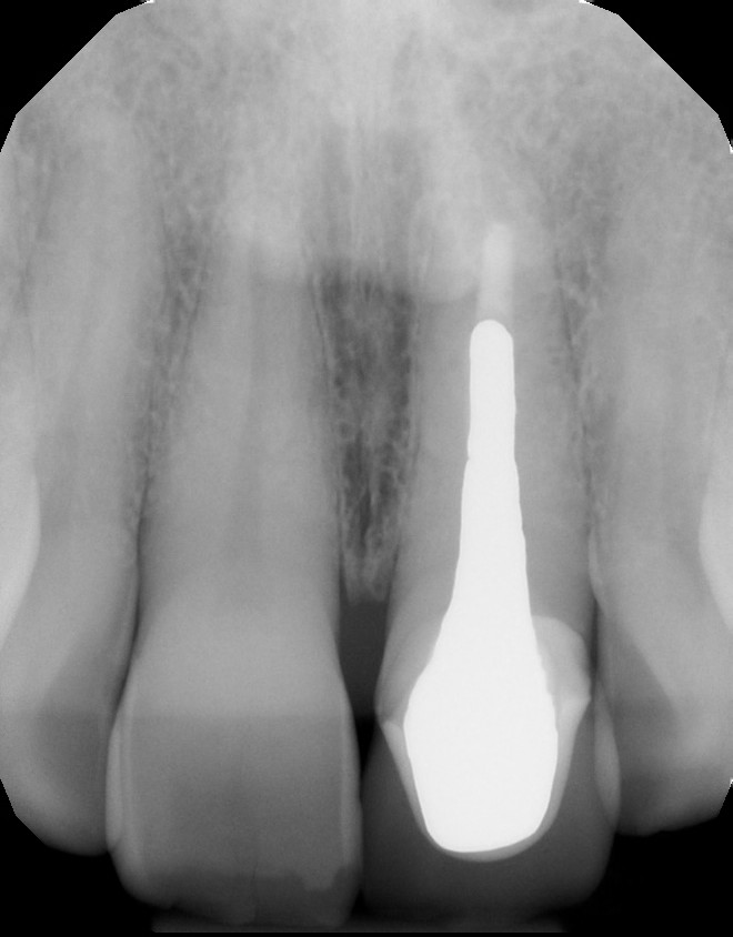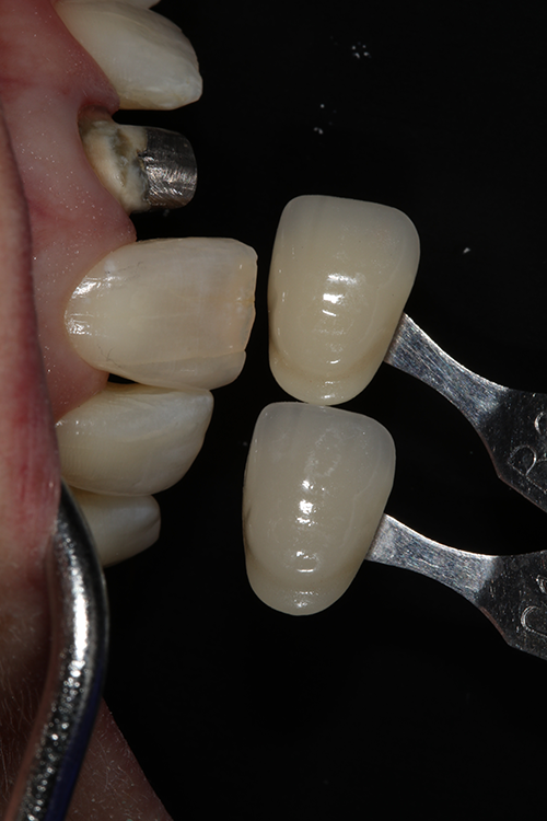 The comprehensive oral examination, which included radiographs, revealed nothing that would contraindicate this treatment plan (Fig. 2). In fact, the previous endodontic treatment was acceptable, and the post was well-adapted to the tooth. The risks and benefits of removing the post were discussed with an endodontist and ultimately the patient, and it was decided to leave the existing cast post and core in place. However, doing so would create prosthetic challenges, including identifying a material that offered an esthetic outcome while blocking out the dark-colored post and core. For this reason, a full-coverage crown fabricated from zirconia was recommended and accepted by the patient.