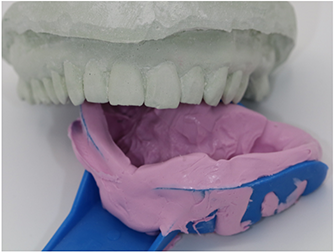 The previously made silicone matrix was loaded with a dual-cured bis-acryl provisional material (TEMPSMART®, GC America) and placed over the preparation. The material was allowed to set, after which the matrix and provisional were removed from the mouth.