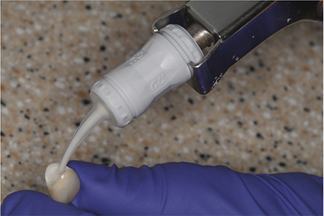 A resin-reinforced glass ionomer cement (GC Fuji PLUS, GC America) was then prepared by activating the capsule with the dispensing gun and placed in the triturator for 10 seconds. The internal aspect of the restoration was then coated liberally with cement (Fig. 10), after which the restoration was immediately seated onto the preparation while maintaining moderate pressure (Fig. 11).