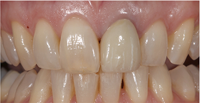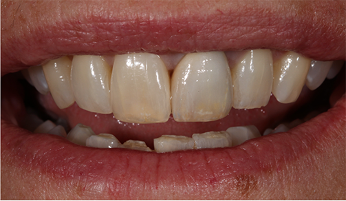 The patient also reported that she was never happy with the restoration, and she also was unhappy with the incisal chipping on tooth #8. Since she was about to embark on a new career, she wanted a smile she felt confident about.