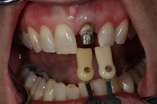 A 60-year-old female presented upon referral from her general dentist for prosthodontic treatment when she requested a new full-coverage crown restoration for tooth #9. She fractured the tooth participating in gymnastics as a child. The tooth was initially restored with composite resin, but when it became discolored, endodontic therapy followed by placement of a cast post, core and crown was performed. The ceramic on the mesial-incisal portion of the crown had fractured (Fig. 1), so the patient reported that it was finally time to replace it.