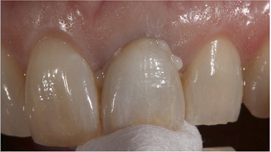 The provisional was trimmed, after which the color and shade were customized using a light-cured characterization composite for direct acrylic restorations (OPTIGLAZE™ Color, GC America), and then light-cured. The provisional was polished, loaded with a non-eugenol, zinc-oxide provisional cement (GC TEMP ADVANTAGE®, GC America), and seated onto the preparation for tooth #9 (Fig. 7).