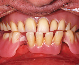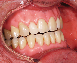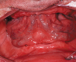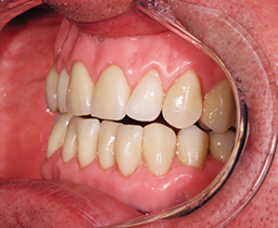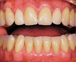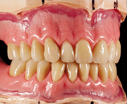 The final set-up was duplicated with hydrocolloid for flasking and transferred into polymer with the auto-polymerizing and pourable Castdon Resin (Dreve Dentamid, Unna, Germany). To establish an individual and lifelike gingival architecture, internal colors of the DentureArt System (Dreve Dentamid) were applied into the flask before the pouring technique took place. After the polymerization, excess sprue, bubbles and small defects were removed with a rotating instrument. Polishing was conducted with pumice and shine on a polishing wheel. A handpiece and a bristle brush were used to finish the teeth around their necks and margins. The functional aspect of switching from a Class III to a Class I bite was successful. The optimized fit of the new dentures provided stability and comfort, the esthetic zone presented an excellent esthetic play of light and colors, and the patient was extremely satisfied with his new economical rehabilitations.
