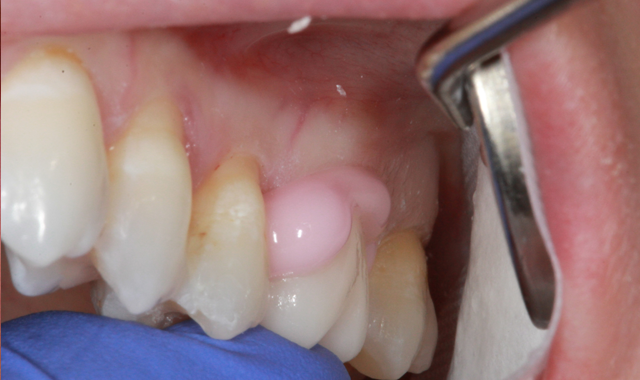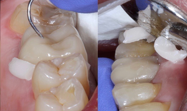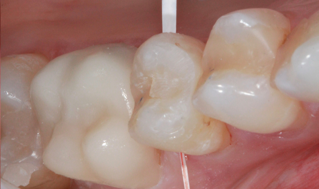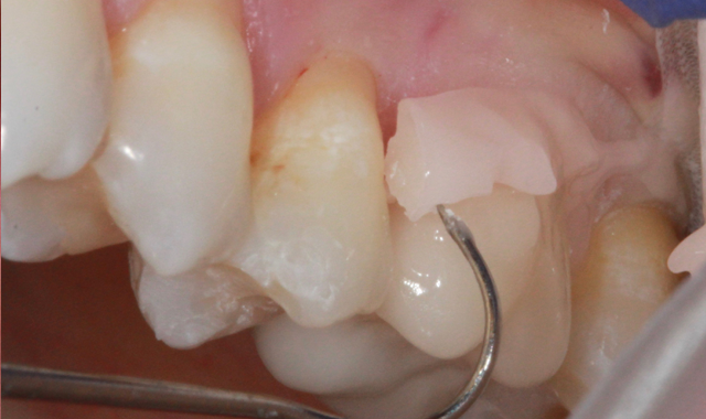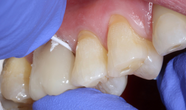 Once the cement has changed to white, you know it is time to clean it off the tooth. It comes off very easily in large pieces on both the buccal and lingual (Fig. 8) and then floss is used to clean out the inter proximal areas (Fig. 9). After tooth is flossed, a 10-second light cure is done and the bite is checked, adjusted if needed and polished. The best part about the cement is how gentle it allows us to be with the surrounding tissue while cleaning up. You can see evidence of this in the post pick shown immediately after clean up (Fig. 10).