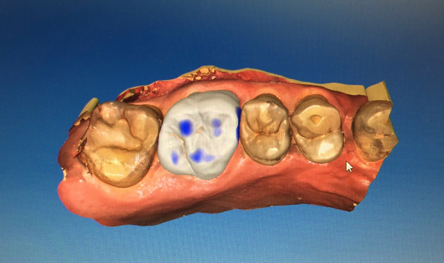 At that point, the prep was scanned using the CEREC omnicam and the crown was designed (Fig. 3) and milled out of eMAX CAD A3 LT block. The porcelain was prepped using porcelain etch for optimal adhesion to the resin cement (Fig. 4).