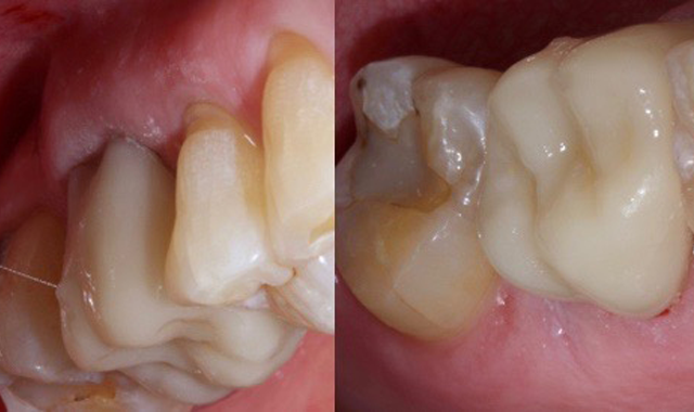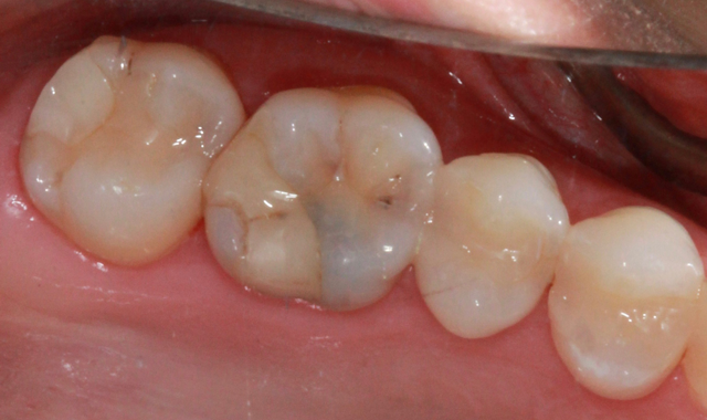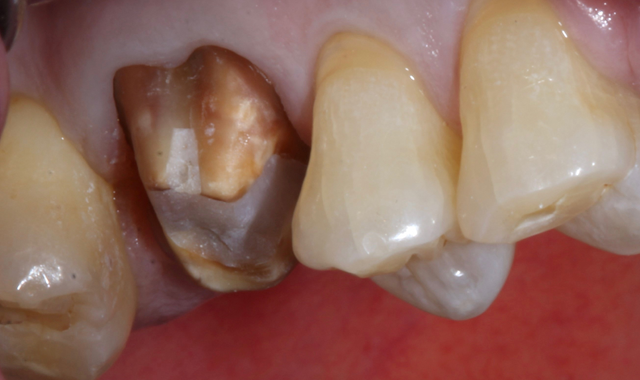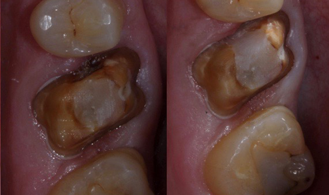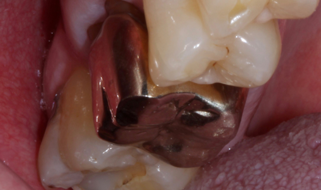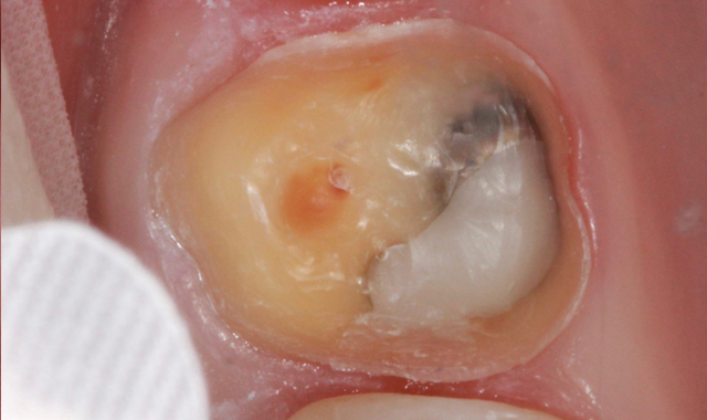 A 74-year-old patient presented with deep mesial decay under his gold crown on #3 (Fig. 1). The crown was removed showing the extent of the decay, so the decay was removed until healthy tooth structure remained (Fig. 2).