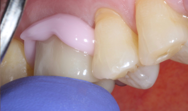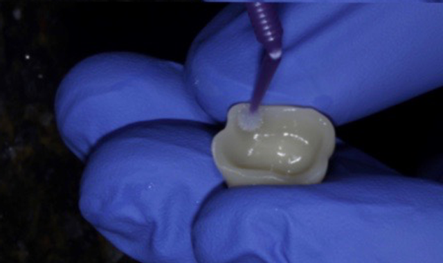 Next the tooth was washed, rinsed and ready for cementation (Fig. 5). At this time, Maxcem Elite Chroma was injected into the restoration as a white resin cement but within three seconds you can just start to see a hint of pink in the cement (Fig. 6). The restoration is seated over the clean prep and firm pressure is applied as we wait for the pink to turn back to white, which indicates ideal cleanup time (Fig. 7). If you start to clean things up while it is still slightly pink you will notice the cement is still tacky to the touch