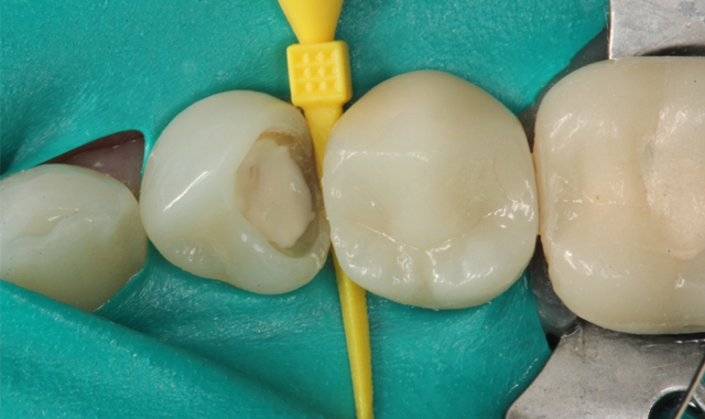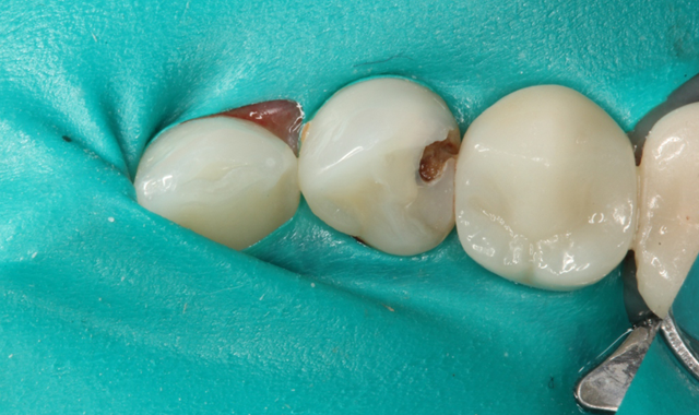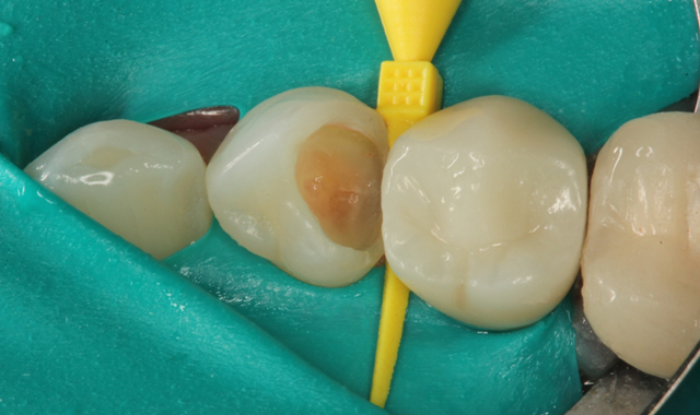 Knowing when to stop removing carious dentin can be difficult, especially when the exact location of a pulp horn or chamber is not known. Most clinicians rely upon tactile sensation or the hardness of the dentin to determine when to stop excavating. When near the pulp, it is advised to stop excavating and leave a layer of affected dentin.