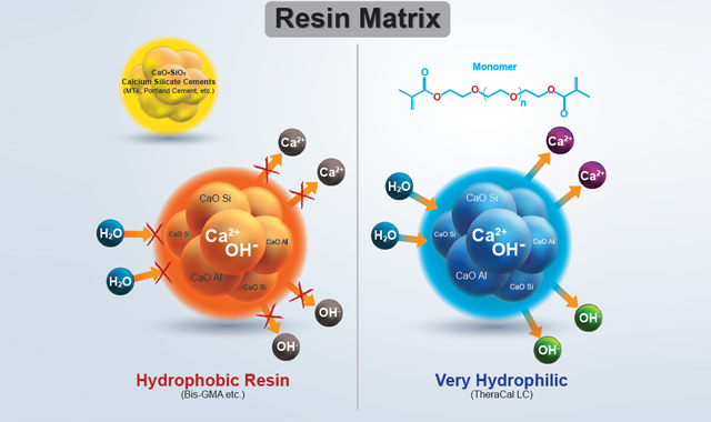 TheraCal LC may act as a scaffold for reparative dentin formation. Dentinal fluids are absorbed within it, resulting in the release of calcium and hydroxide ions, and the tooth responds to form apatite and a bond, supporting the natural sealing ability of the product. This ability to assist in the formation of apatite plays a critical role in pulpal protection.