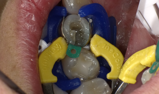 In one case, the patient presents with mandibular right first premolar with an open contact and a defective composite restoration. The tooth was anesthetized using a Milestone STA machine using buffered 4 percent Septocaine with a PDL injection. The tooth was isolated with a DMG Mini Dam and the composite and decay were removed. A Triodent sectional tab matrix band was placed along with a white V-wedge. The V-Ring was placed to establish proper contact.