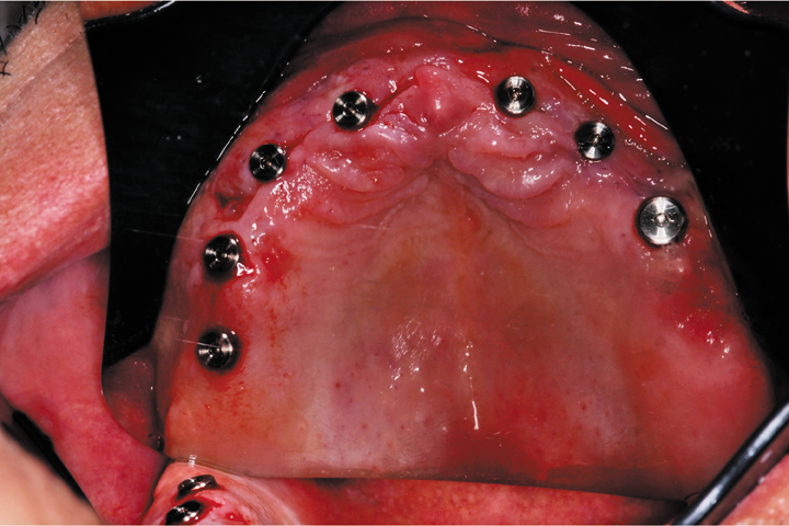 "If the case is ideal and just seems super easy, I will freehand it," Dr. Ghaboussi says. "But if there is any kind of tricky part to it or angulation or the access is difficult, we just go ahead and have a surgical guide made. The cost of a surgical guide has come down significantly, so it just makes the workflow so much easier and cuts down on wasted time. The surgical guides can really simplify the case. Even if you're removing 20 teeth and leveling bone and placing implants, for me that would have been a half-day procedure-start at 7 a.m. and finish at 1 p.m. And now you can do that in an hour or two, using surgical guides. The labs make a bone-leveling guide, so you extract the teeth and flap back the tissue, and the lab has made a guide that you put over the bone. Then you just flap-out down to the level of the bone, and then you place the implant guide on the bone and screw it in so it can't move, and then you place the implants and you're done."
