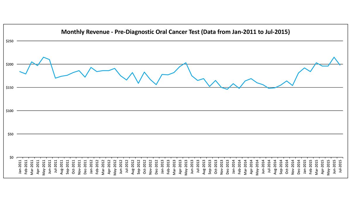 The average monthly revenue generated by a dental office from the oral cancer pre-diagnostics code was around $200, but sloped down to as low as $150 in 2013 and 2014. Revenue rose in 2015 back up to around $200, consistent with the increase in number of screenings performed in clinics.