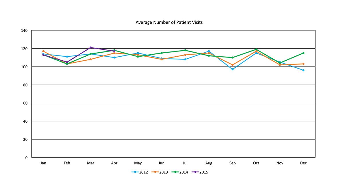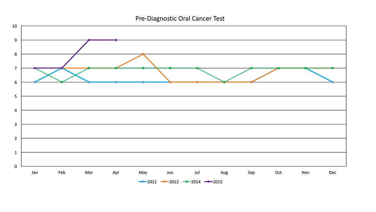When compared to number of patient visits, the number of oral cancer screenings is small. During the first four months in 2015, the average number of patient visits was 114, while the average number of oral cancer screenings was eight. This indicates that while dentists may be watching for signs of cancer, they are not as frequently using technology and billing the CDT 4D031 code. Dentists may not complete this type of testing because of cost concerns, level of cancer risk to the patient and time constraints.