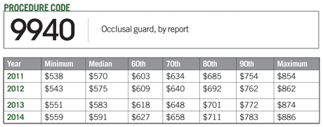 The occlusal guard (D9940) and the occlusal orthotic device (D7880) are often confused. Report D9940 to describe an occlusal guard for minimizing the effects of “bruxism” and “clenching of teeth.” Use D7880 to report an appliance provided to treat TMJ dysfunction. Removable dental appliances, which are designed to minimize the effects of bruxism (grinding) and other occlusal factors. The occlusal guard fee will typically vary from $250 to $595, depending on the type of appliance. Factors such as the laboratory bill, the clinical technique used, and the total number of visits for impressions, delivery and follow up may affect the fee charged. Occlusal guards usually require two or more visits to deliver the appliance.