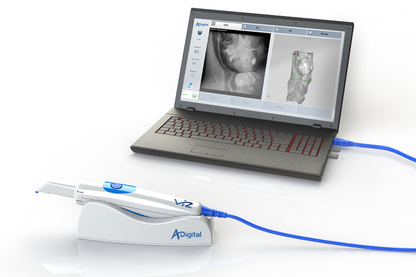 • The handpiece is approximately the size of a toothbrush and connects to a laptop to complete the intraoral scanning system