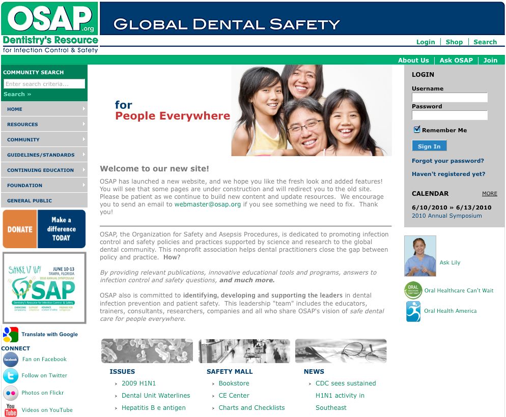 A new social networking capability allows OSAP members to connect with each other, as well as follow the organization on Facebook and Twitter, view photos and videos on Flickr and YouTube, and subscribe to the RSS feed. A Safety Mall offers products and services relating to infection control and includes downloadable materials, for those with an immediate need. The new site features a fresh look and many new features.