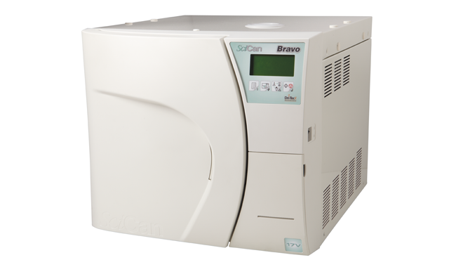 The BRAVO is a fractionated vacuum sterilizer that incorporates both pre-vac (to remove air) and post-vac (to ensure a dry load every time) cycles to ensure the perfect steam penetration for any load.The BRAVO reportedly offers the perfect blend of speed and capacity with total cycle times, including drying, set at about half the time as other conventional chamber autoclaves. The BRAVO 17V, with a 17-liter chamber, has a large vacuum pump and employs a fast and consistent dry load in only 34 minutes. The BRAVO 17V comes standard with five sterilization trays, increasing load capacity and office efficiency. The other BRAVO model, the BRAVO 21V, features a 21-liter chamber and a top filling port as well as a front mounted master drain port, and an integrated USB port for data logging.