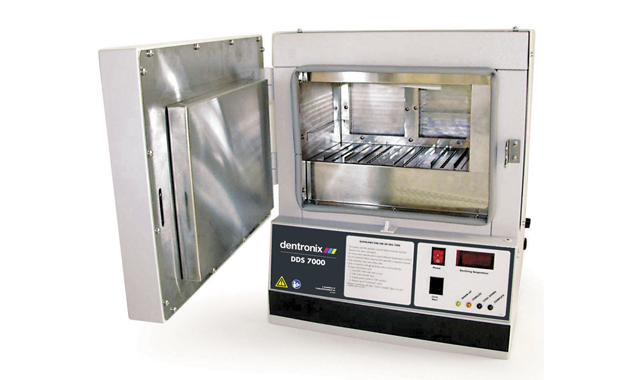 The DDS7000 is the latest model in the series of rapid dry heat sterilizers from Dentronix. Specifically designed for the processing of orthodontic pliers, the convective heating action sterilizes a full load of 36 pliers in 37 minutes at 191°C. At the completion of each cycle, pliers are at a safe temperature for immediate handling. The DDS7000 reportedly provides a moisture-free inert process that keeps sharp edges sharp and prevents rust in hinged joints. Various loading options are available, from upright racks to horizontal trays to allow processing of many types of instruments. Combined with its ultrasonic cleaning systems and non-ionic cleaning solution, the DDS7000 is engineered to be part of an effective an efficient instrument processing system. Dentronix sterilizers are manufactured and serviced in Cuyahoga Falls, Ohio.